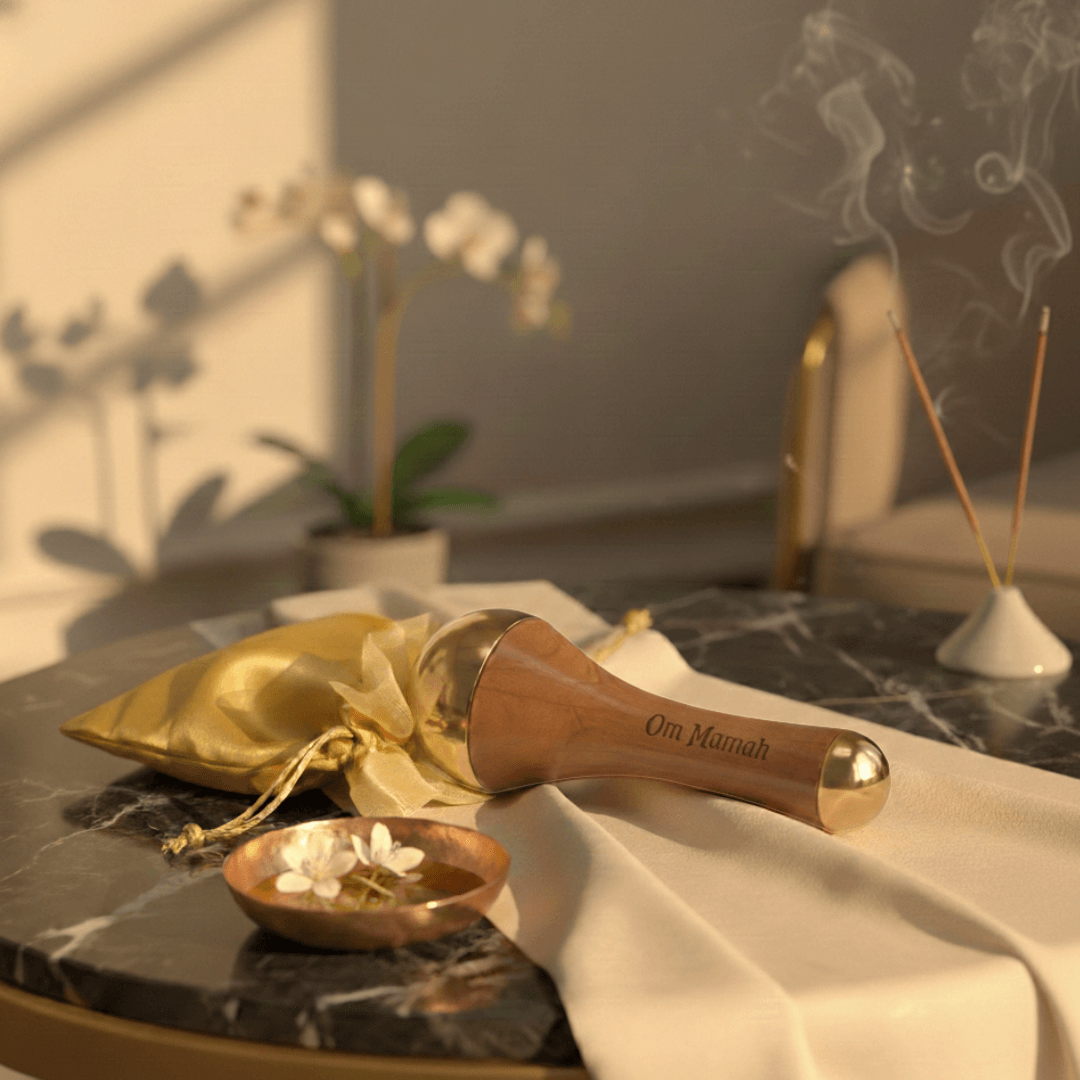 Handcrafted from sacred Kansa, this wand works as both a facial massage tool and a body revitalizer. It naturally balances your skin’s pH, boosts circulation, reduces puffiness, and lifts tired, aging skin — giving you a luminous glow at home, anytime.