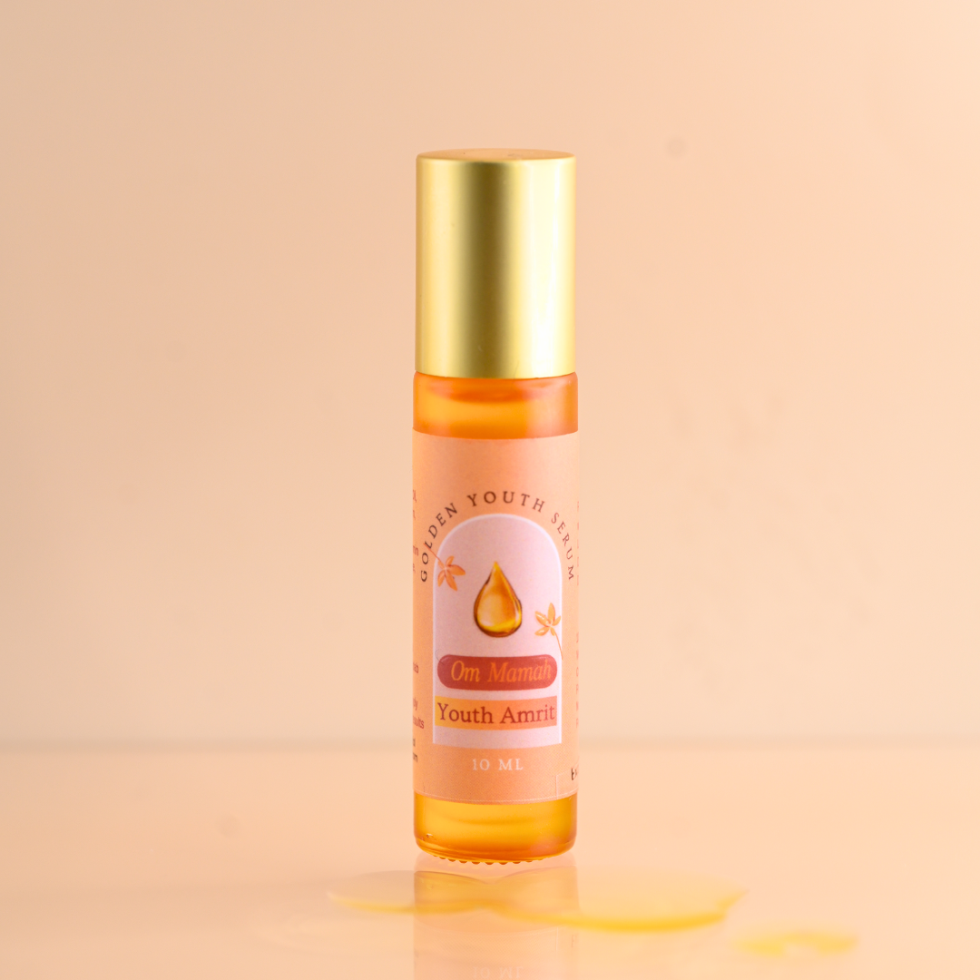 One 10ml Om Mamah Youth Amrith Skin Serum with a metallic roller applicator cap